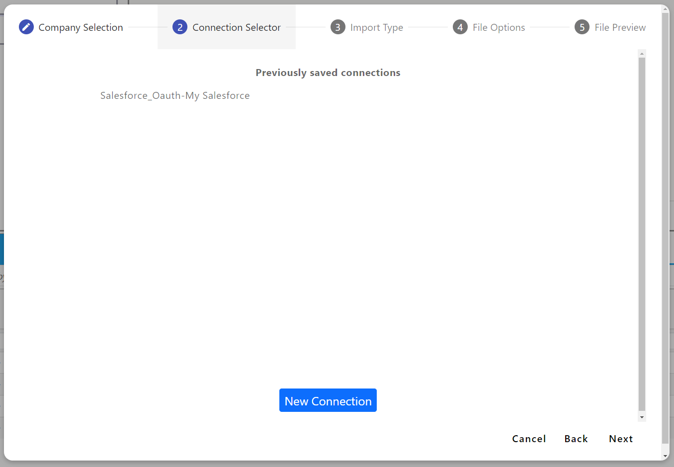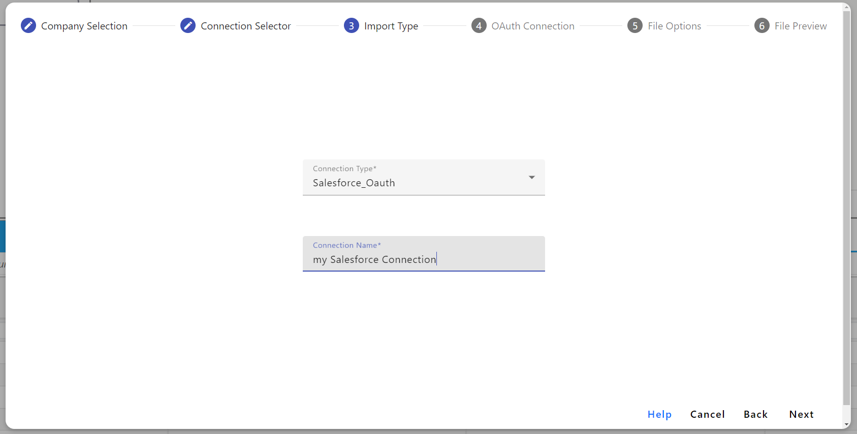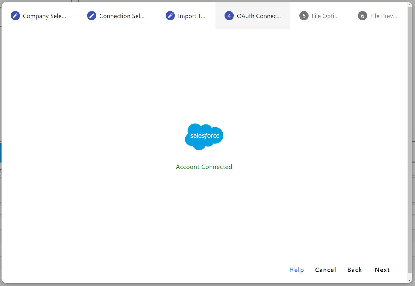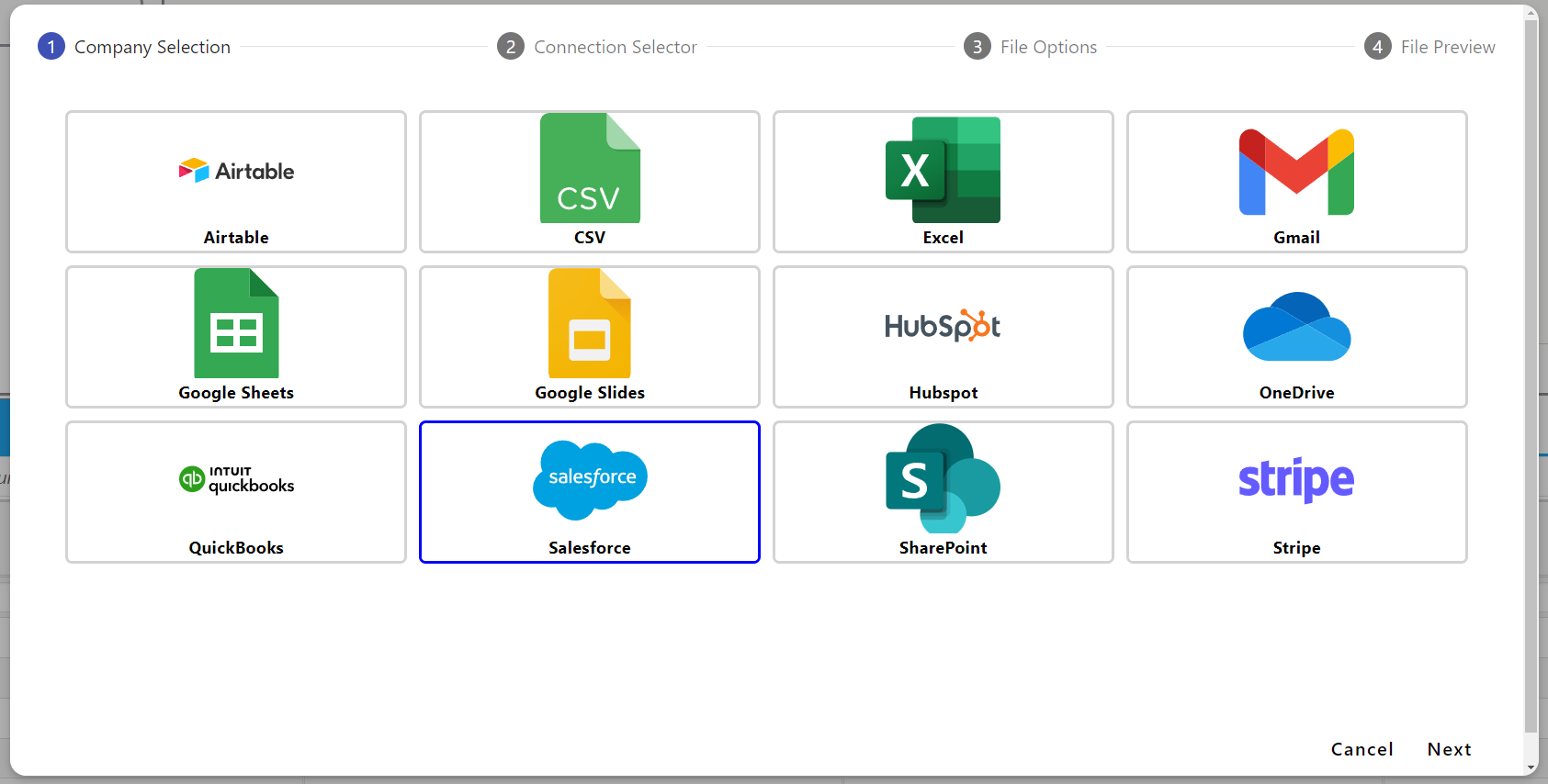 Step 1: Select Salesforce from the import screen, and then click Next in the bottom right.
