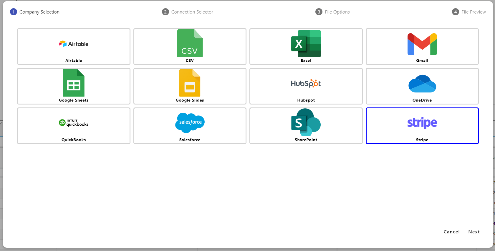 Step 1: Select Stripe from the import screen, and then click Next in the bottom right.