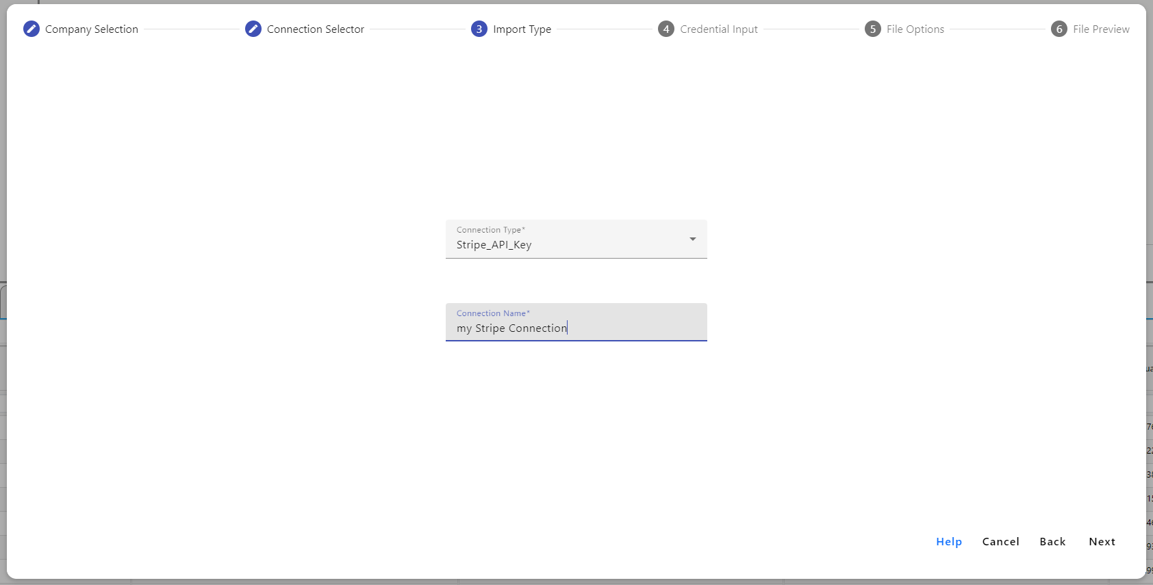 Step 3: Select Connection Type Stripe_API_Key and type a custom name to label you connection in Connection Name